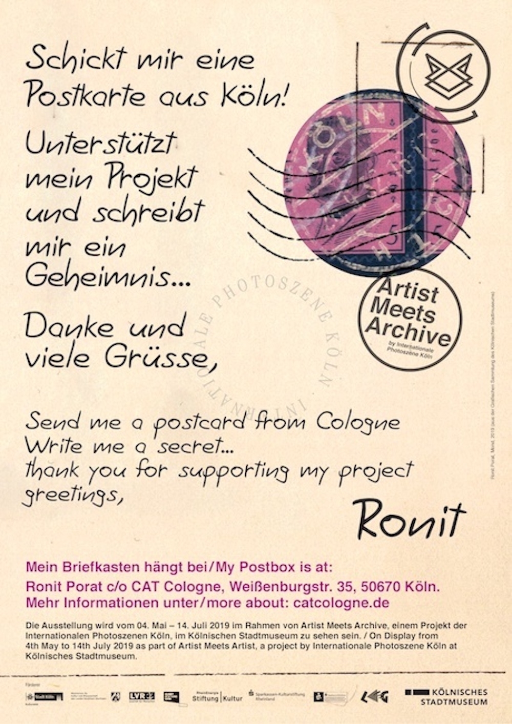 Wir freuen uns, dass Ronit Porat Dank CAT Cologne schon vor der großen Eröffnung des Photoszene-Festivals im Mai 2019, nämlich bereits im März, anreisen, in Köln leben und arbeiten kann.
